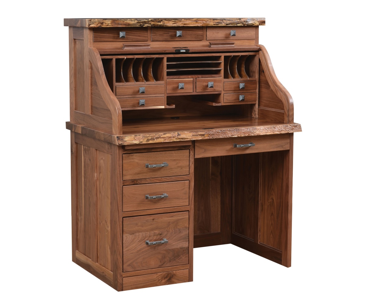 Features: • Rolltop lid to close • Dovetailed drawers • File drawer on the bottom of the drawer stack