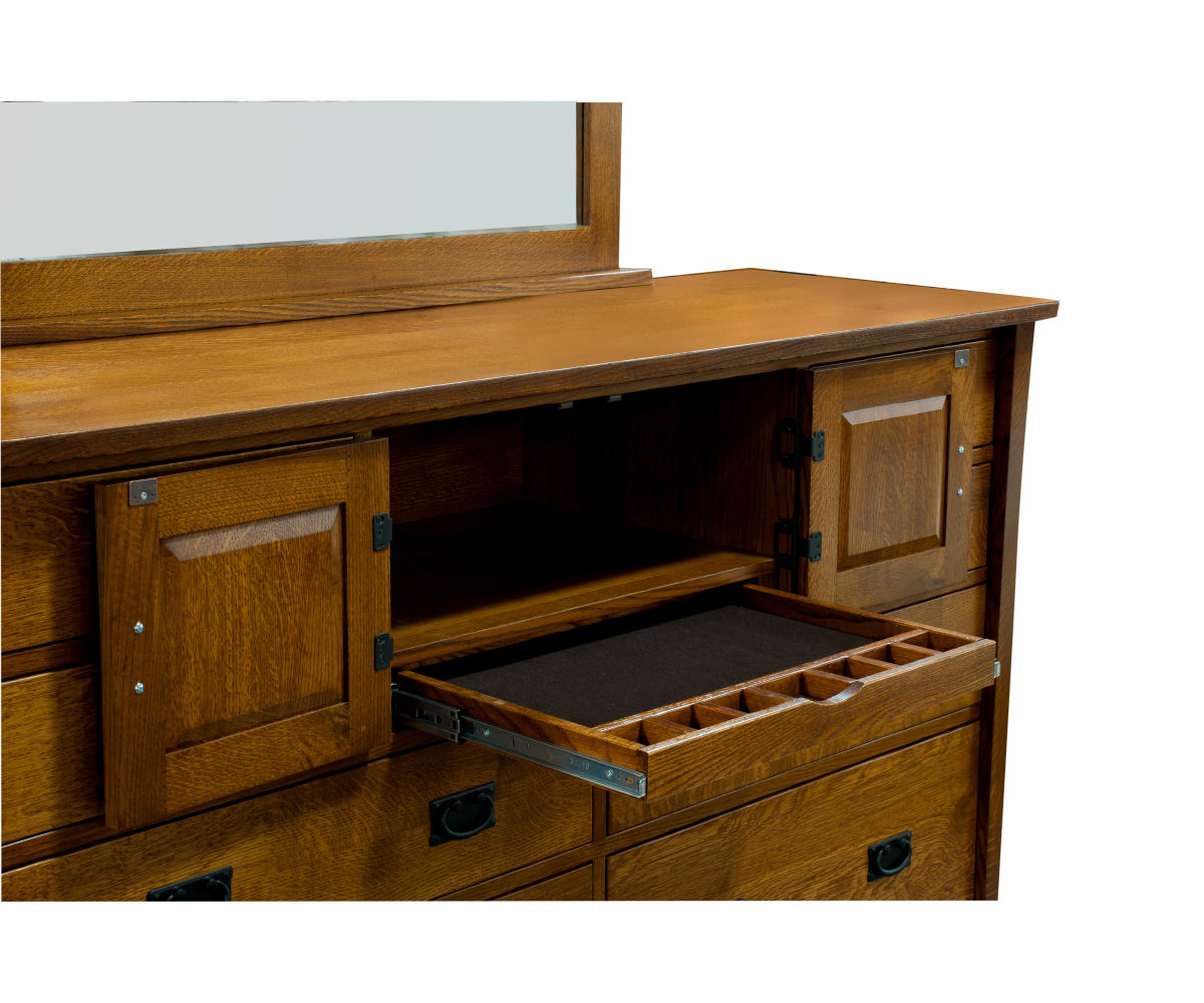 Features: • Dovetailed drawers • Full extension drawer slides • Doors conceal a shelf and velvet lined jewelry drawer