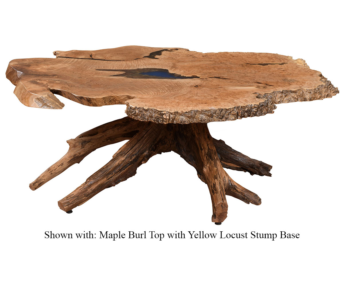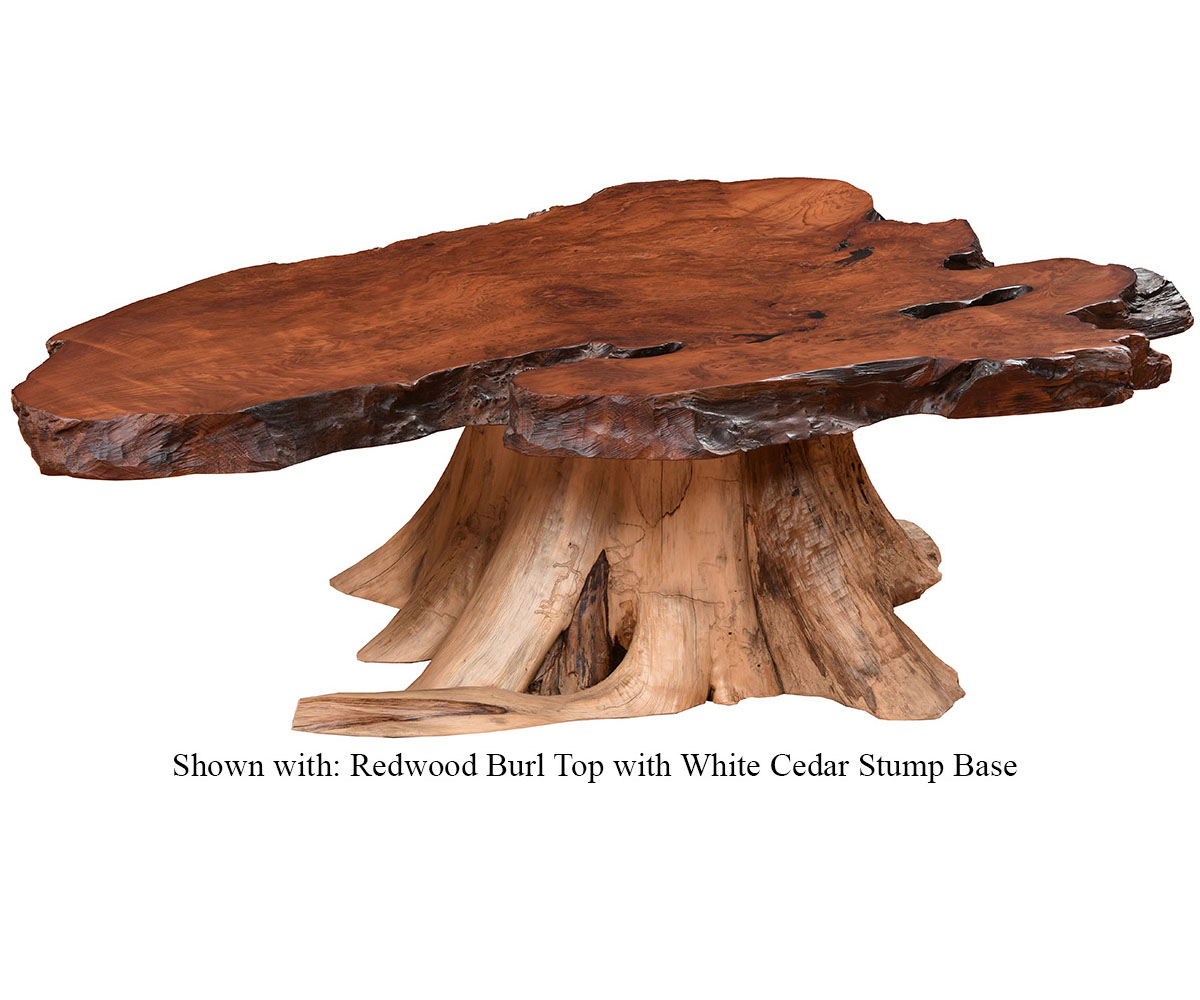 Features: • Live edge on the table creating a piece of art • Each burl top has its own look these are only examples • Each stump is unique as each tree is different