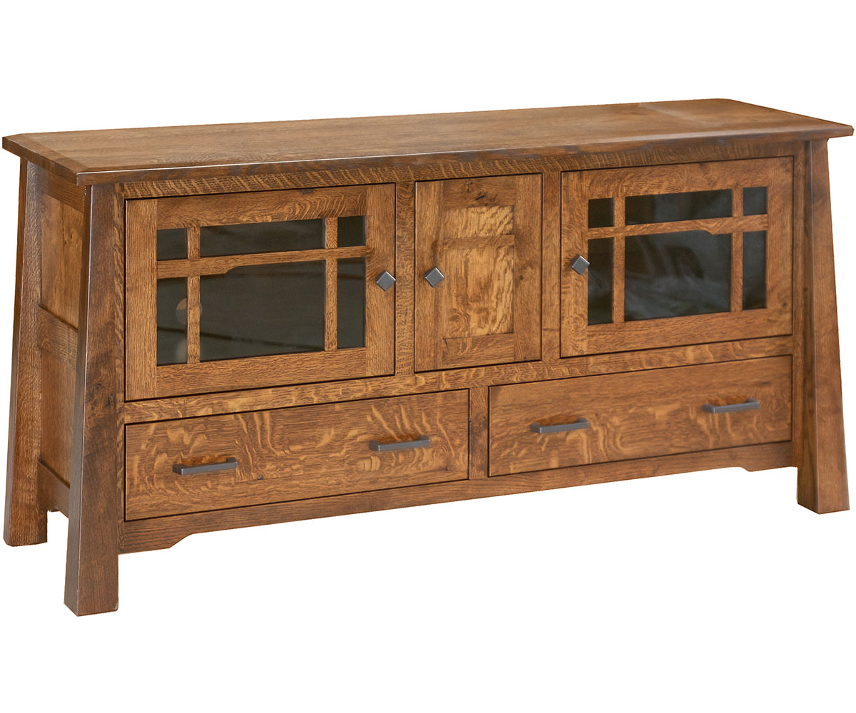 Options: • Sound bar shelf • Live edge top • Soft close drawer slides • Mullions in the doors (shown)