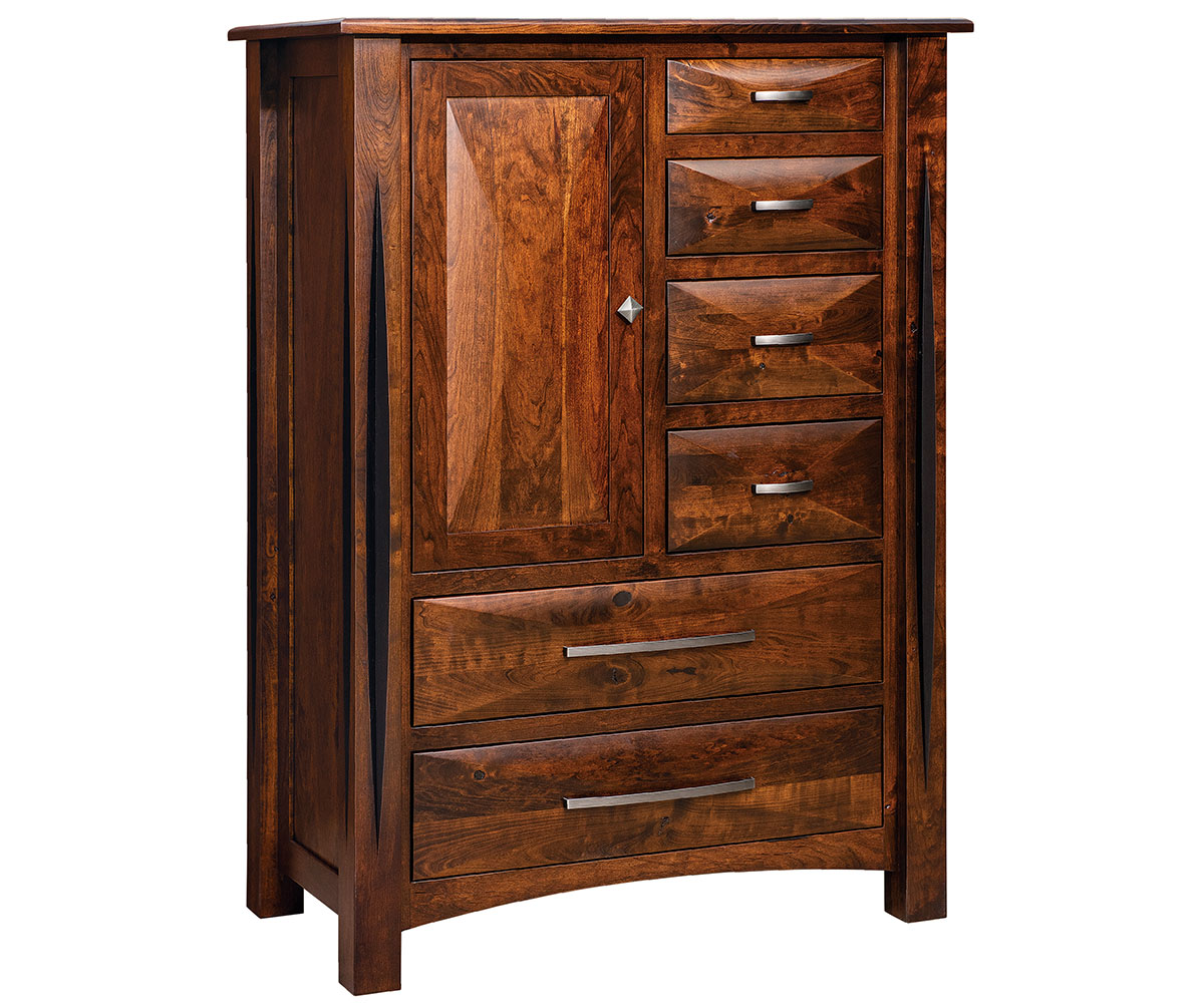 Features: • Clothing rod behind the door • Two shelves behind the door • Carved detail in legs – shown with dye • Dovetailed drawers • Soft close full extension undermount drawer slides