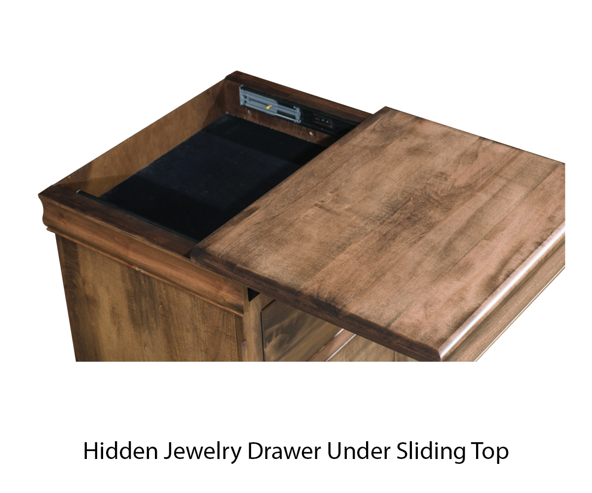 Options: • Hidden jewelry drawer under the sliding top