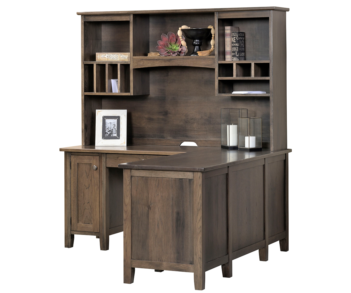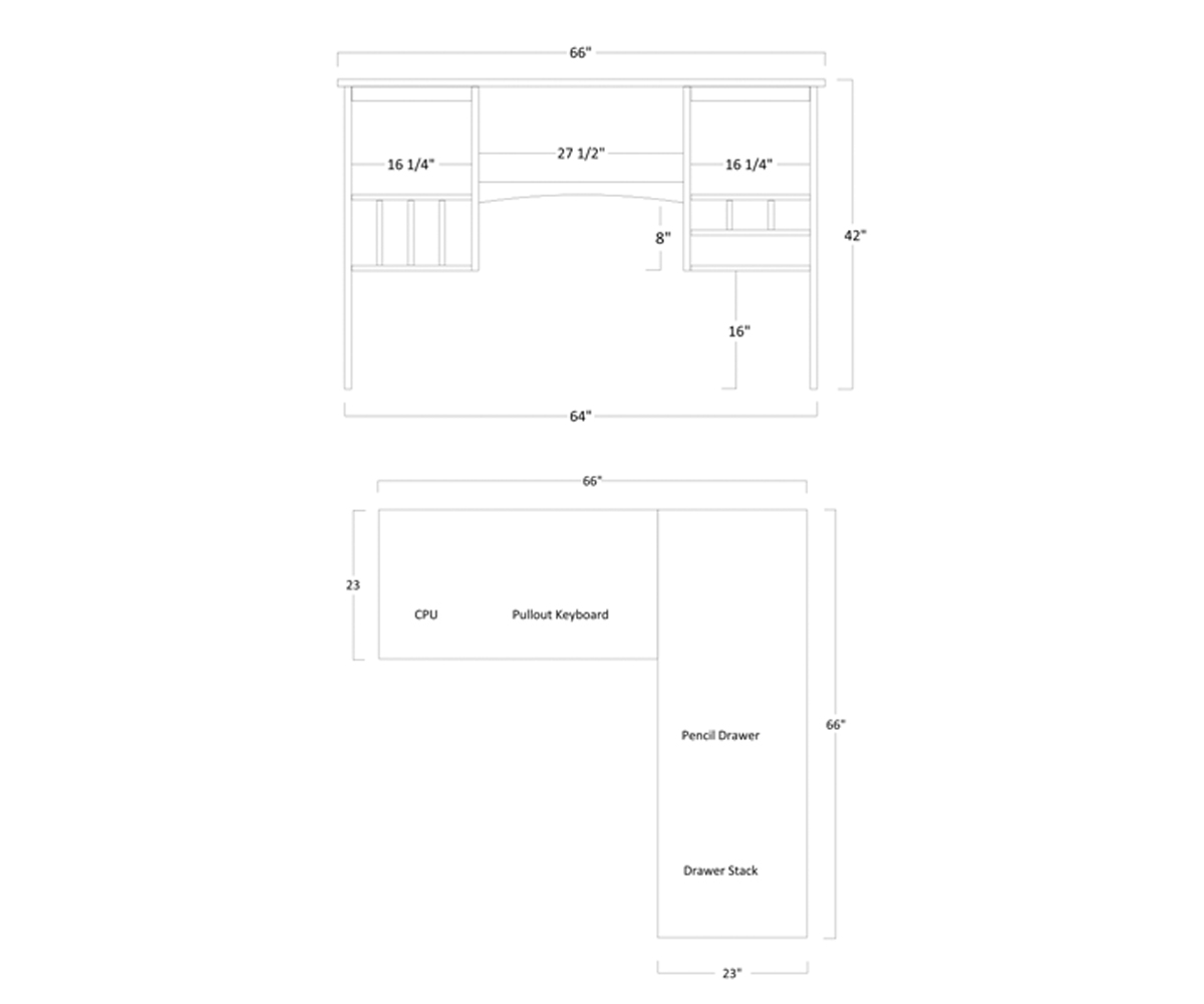 Dimensions: Desk: 66″W x 66″D x 30½”H Hutch: 67½”W x 14¾”D x 45″H