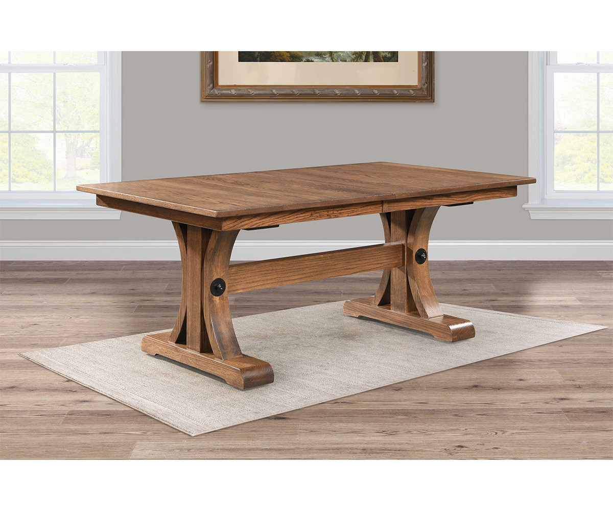 Features: • Black bolt detail • 12″ wide leaves • Leaves can self store inside table • Wooden equalizing gear slides to extend table