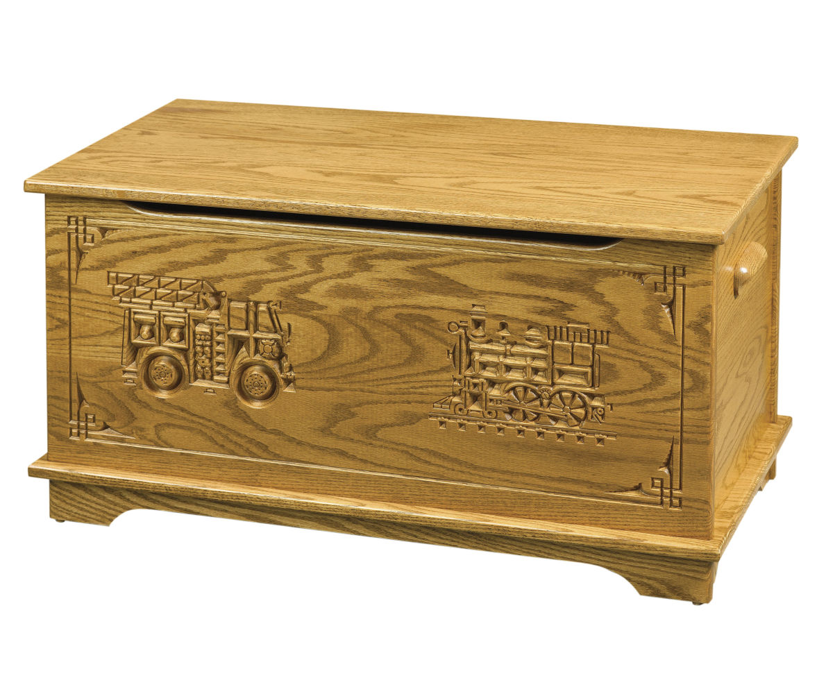 Features: • Child safety hinge on the toy box lid • Cutout in the front for extra protection when closing the lid • Truck and train engraved in the front panel