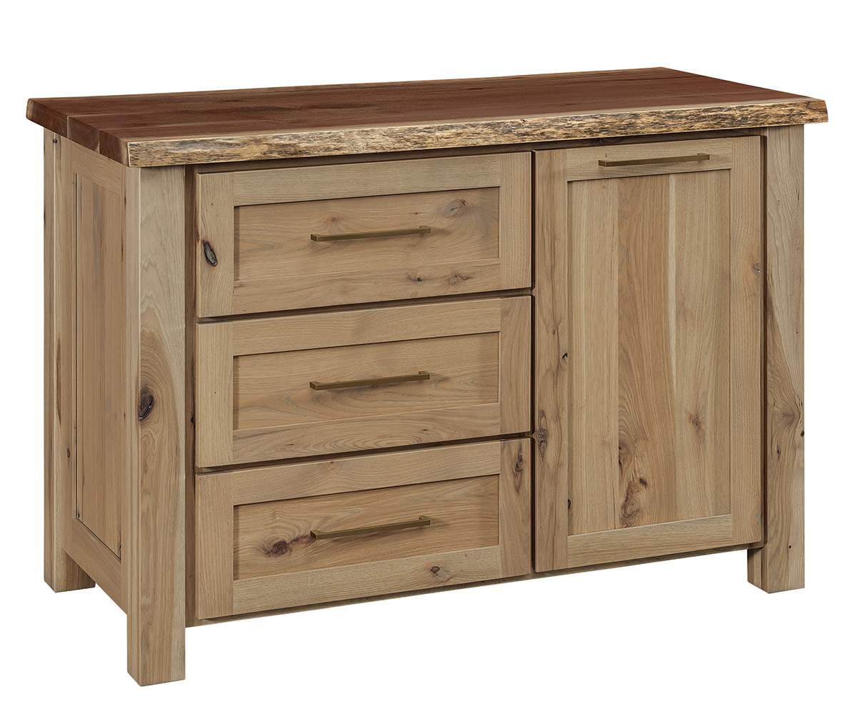 Features: • Live edge top • Dovetailed drawers • Full extension drawer slides • Pullout cutting board above trash can drawer • Double trash can pull out behind the door